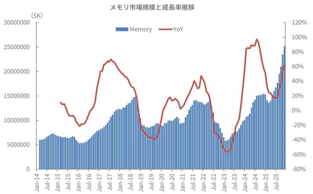 如上图所示,根据以往的模式,存储器市场增长率呈现四年周期性波动,在2017年中期达到峰值,2019年中期触底,2021年下半年再次达到峰值,2023年中期触底。按照这种模式,人们可能会预期峰值出现在2025年,谷底出现在2027年。