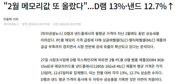 2月28日,据韩媒报道,今年2月,动态随机存取存储器(DRAM)和NAND闪存(NAND Flash)的平均价格延续了此前的上涨趋势,双双实现超过12%的环比增长,这也是两类主要存储芯片平均价格首次同时录得两位数的月度涨幅。