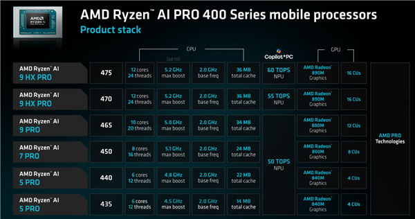 一共六款型号,分别为锐龙AI 9 HX PRO 475/470、锐龙AI 9 PRO 465、锐龙AI 7 PRO 450、锐龙AI 5 PRO 440/435。