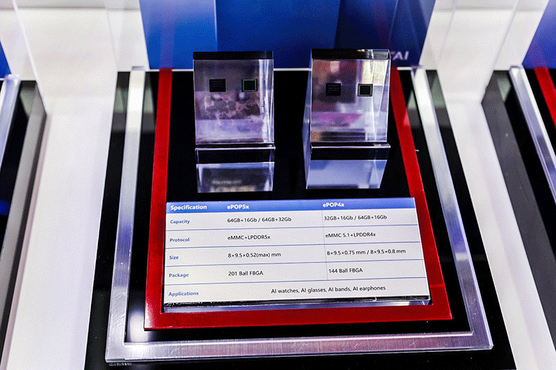 江波龙此次还展示了面向 AI 可穿戴设备的 ePOP5x。其合封了 LPDDR5x 内存与 eMMC 5.1 闪存,在保持与 ePOP4x 相同尺寸的基础上,封装厚度缩减 35%、最薄处仅 0.52mm,同时 DRAM 传输速率高达 8533Mbps,支持多种容量组合配置。