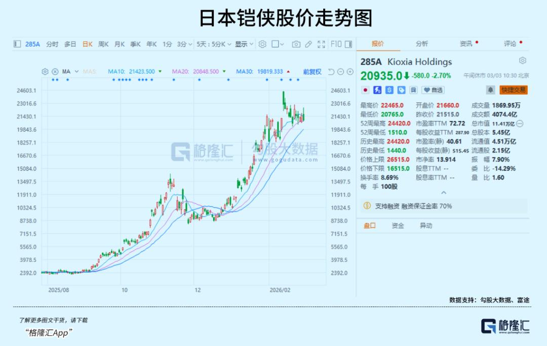2月12日,日本存储巨头铠侠发布了炸裂的第四财季指引:预计单季营业利润高达4400亿至5300亿日元,仅一个季度的利润就将超过前三财季的总和。财报发布后,铠侠股价两日大涨超20%,最高股价较2024年底IPO时翻了超过17倍。
