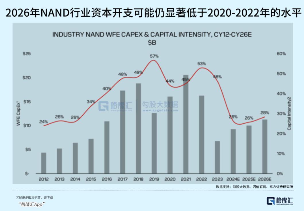 据2025年闪迪投资者关系日资料的预测,2026年NAND行业资本开支虽然较2023年低点回升,但仍显著低于2020-2022年的水平,产能扩张节奏比市场期待的要慢得多。