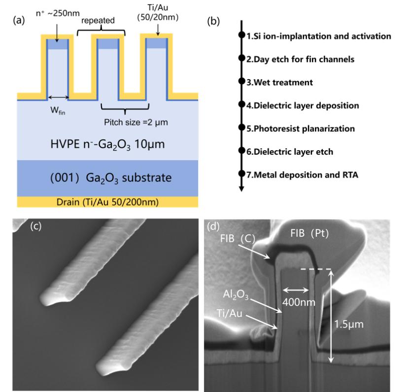 多鳍通道二极管——打破传统垂直结构限制 图(a) 多鳍通道β-Ga₂O₃二极管的示意图,(b) 器件的关键工艺步骤,(c)鳍干法蚀刻后的扫描电子显微镜(SEM)图像, (d) 鳍宽400 nm二极管 SEM横截面图像