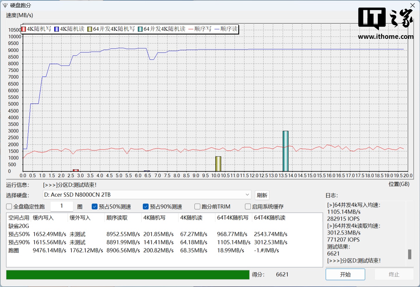 如上图,在白眼 2.5 的半盘与满盘模拟中,其顺序读写及 4K 64T 随机读写性能基本无衰减,综合得分达 6621 分。经过严苛的跑分压榨,其平均顺序读取为 8906MB/s,缓内写入达 9476MB/s,缓外写入 1762MB/s。