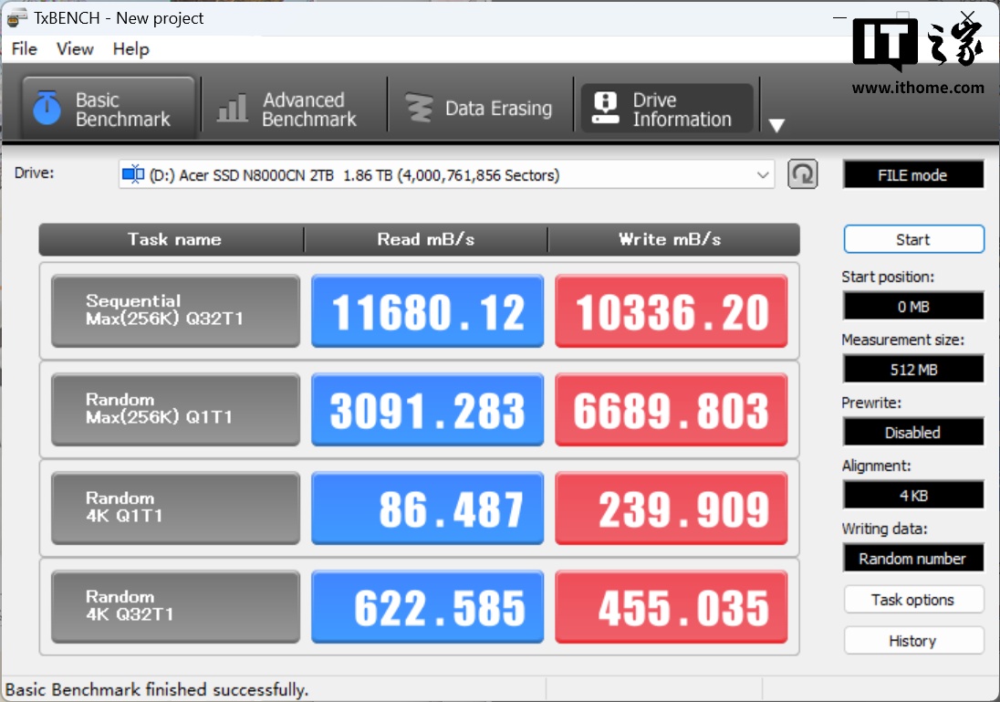 在理论性能方面,N8000 的最高顺序读取速度可达 11000MB/s,顺序写入速度达到 10000MB/s,随机读写性能双双达到 1700K IOPS。宏碁 N8000 还引入了 HMB 机制,并配置了智能 SLC cache 动态缓存技术。