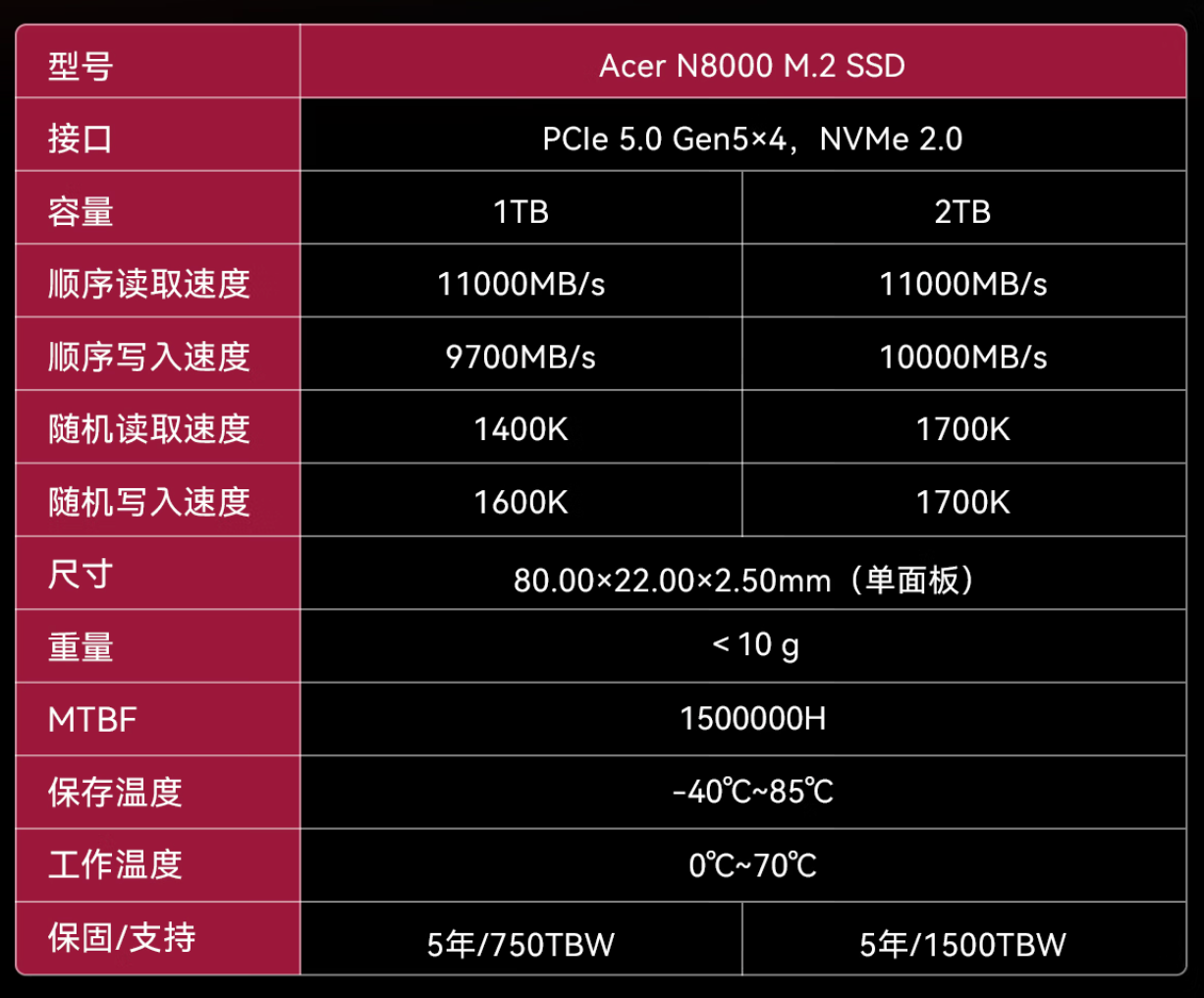 宏碁 N8000 搭配了超薄石墨散热贴片用于核心热量导出,避开了占用空间的厚重金属马甲。产品目前提供 1TB 与 2TB 两种容量版本,其中 2TB 版本的标称耐久度达到 1500TBW。