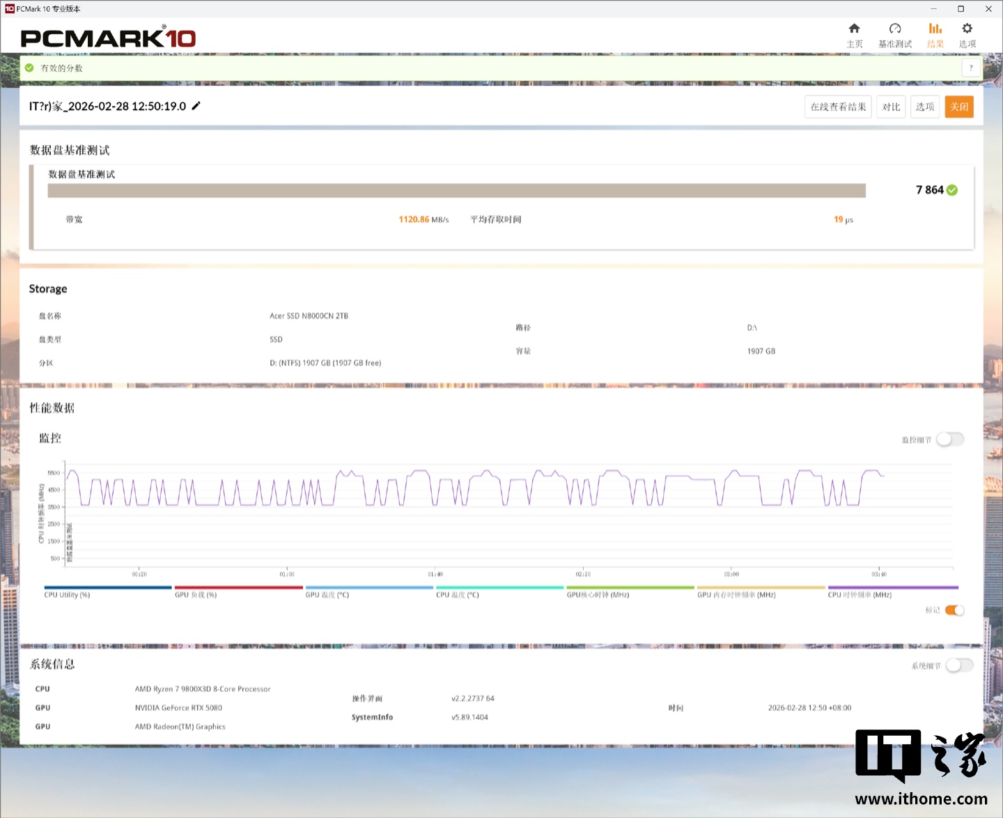 实测结果显示,宏碁 N8000 在该项目中获得了 7864 分的综合成绩,其传输带宽达到 1120.86 MB/s,平均存取时间仅为 19 微秒。作为参考,目前市面顶级 PCIe 4.0 固态硬盘的同项带宽通常在 800-900 MB/s 区间,存取时间普遍在 25 微秒以上。这表明在面对密集数据调用和大型游戏加载等场景时,宏碁 N8000 能够提供优于前代产品的传输效率与更低的响应延迟。