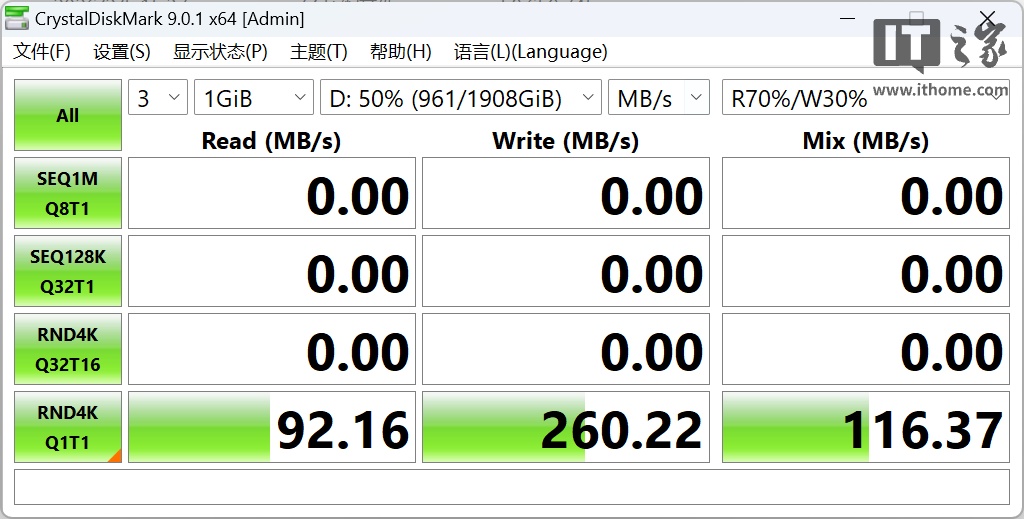 随后,IT之家在 50% 空间占用的半盘状态下进行复测。