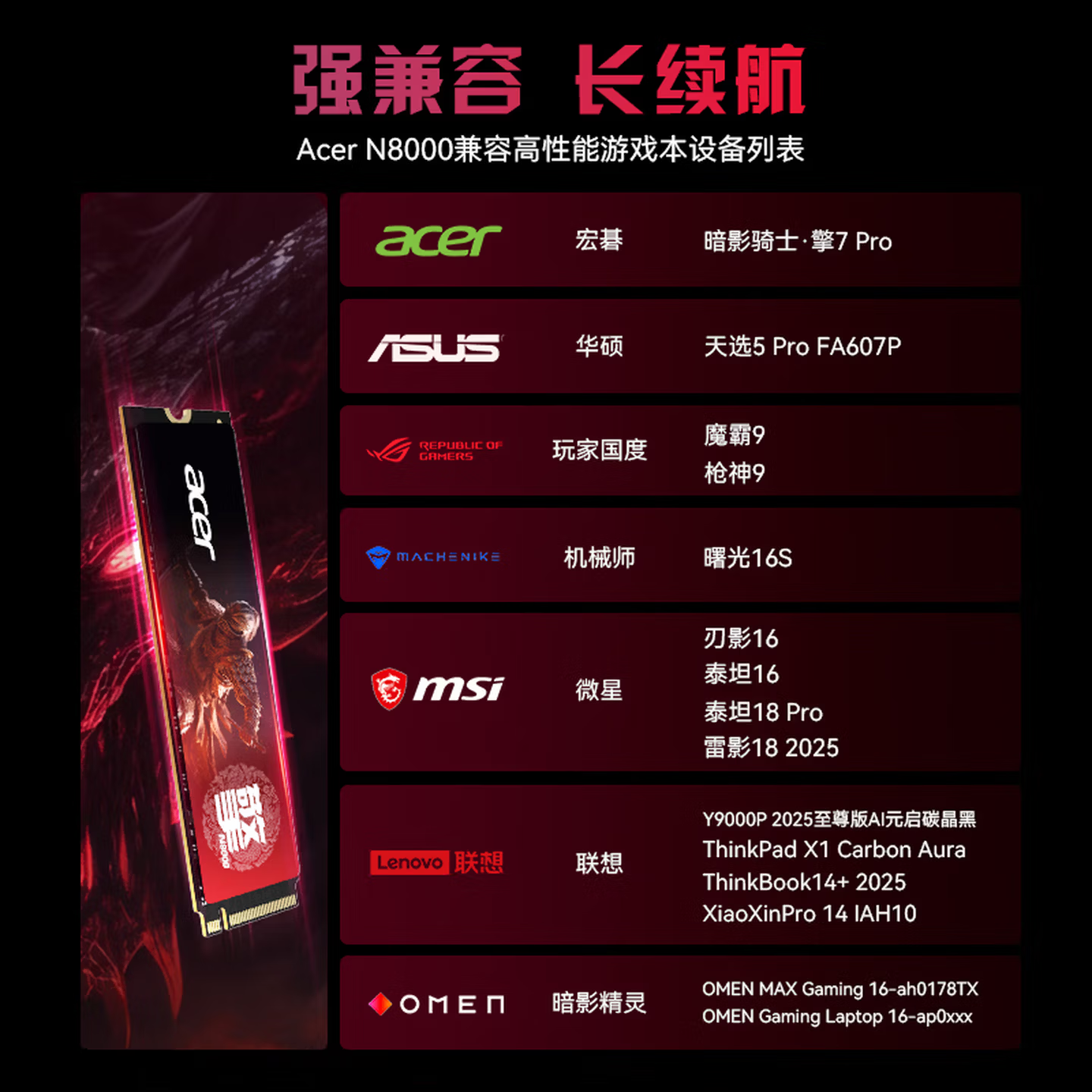 对于台式机玩家来说,它的 Gen5 性能完全达标,足够日常折腾;但如果你用的是游戏本、轻薄本或者迷你主机,那它的优势就彻底凸显出来了 —— 毕竟这些设备内部寸土寸金,对发热和续航又极其敏感,宏碁 N8000 不仅能让你体验到 PCIe 5.0 的速度,还直接避开了厚重马甲装不下、温度一高就疯狂掉速的“老大难”问题。