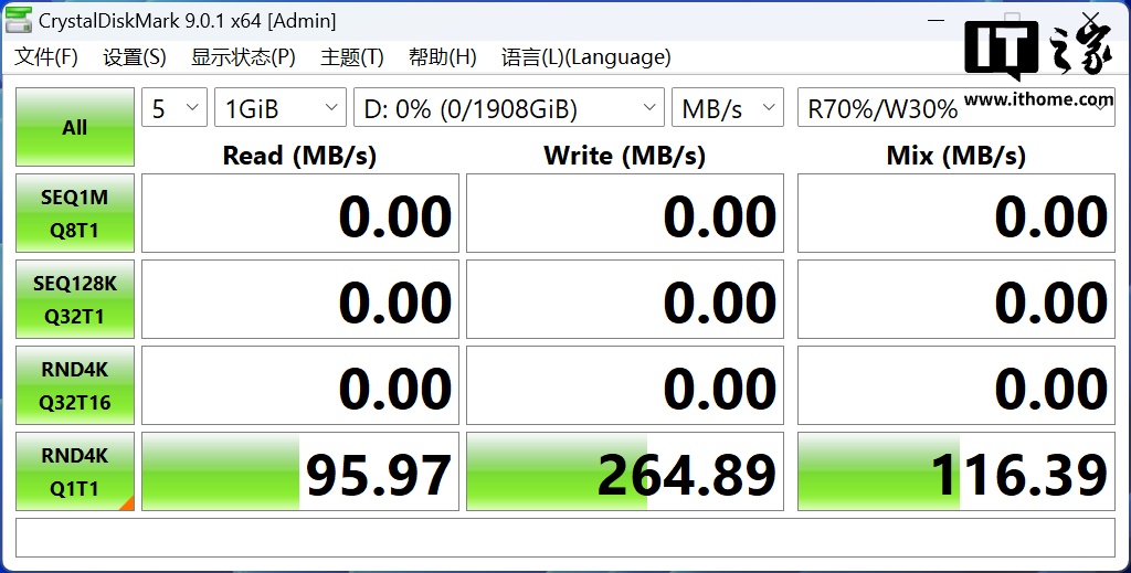 为了进一步探究贴近消费者真实日常的复杂工况,IT之家引入了 4K Q1T1 条件下的“七读三写”(70% 读取与 30% 写入)混合负载测试。在实际的系统运行中,诸如启动大型生产力软件、加载 3A 游戏场景或渲染无缝大地图时,硬盘面临的往往不是单纯地持续读写,而是伴随着大量 4KiB 超小文件的并发混合存取,其中读取指令通常占据主导,且硬盘需要极其频繁地在读、写两种工作状态间切换。