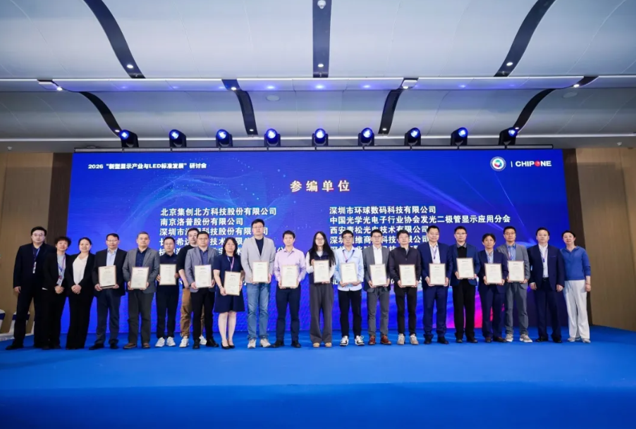 北京集创北方科技股份有限公司、南京洛普股份有限公司、深圳市洲明科技股份有限公司、长春希达电子技术有限公司、杭州海康威视数字技术股份有限公司、浙江大华技术股份有限公司、浙江宇视科技有限公司、北京小鸟科技股份有限公司、深圳市环球数码科技有限公司、中国光学光电子行业协会发光二极管显示应用分会、西安青松光电技术有限公司、深圳创维商用科技有限公司、深圳市兆驰晶显技术有限公司、京东方晶芯科技有限公司、上海寰视网络科技有限公司、北京淳中科技股份有限公司等各参编单位代表一同上台,共同见证这一行业重要时刻,沈小兵、刘秀娟、李燕兰和蔡广超为参编单位颁发证书。