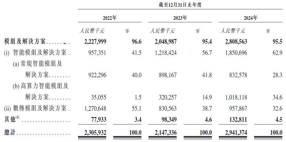 按模组和解决方案划分,2022年-2024年,美格智能的智能模组及解决方案分别贡献了该公司当年度营收的41.5%、56.7%和62.9%,数传模组及解决方案分别贡献了该公司当年度营收的55.1%、38.7%和32.6%。