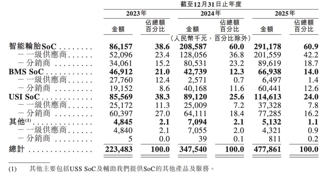 TPMS芯片(智能轮胎SoC)长期占据营收核心地位,其占比从2023年的38.6%持续攀升至2025年的60.9%,意味着公司业绩高度依赖单一细分市场。