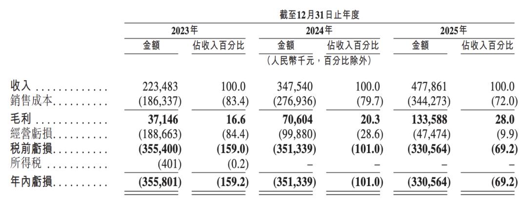 但净利润却给出了截然不同的答案。2023年到2025年,公司的净亏损分别为3.56亿元、3.51亿元和3.31亿元。尽管2025年亏损略有收窄,但相对于营收规模,亏损额依然巨大。