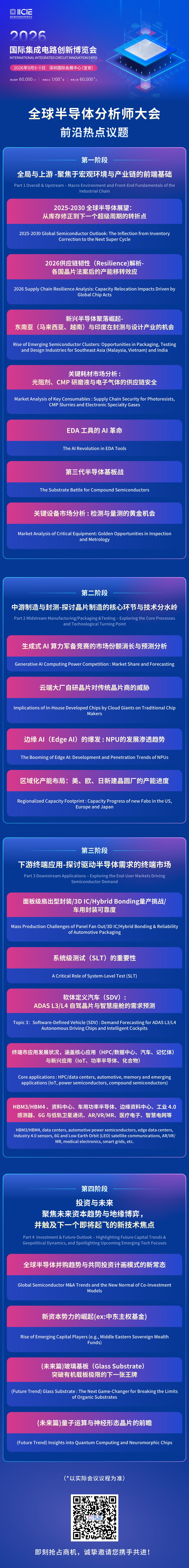 第二,议题设置高聚焦,直击产业核心点。专场议题紧密围绕“中游制造与封测”核心方向。从封测产业的全球化分工与区域转移,到中游制造企业的成本控制、良率提升与效率优化,全方位覆盖半导体中游的核心热点与发展痛点。