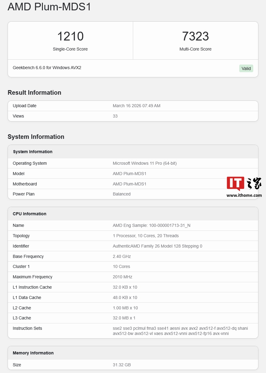 IT之家 3 月 16 日消息,Geekbench 基准测试数据库今日记录到了 AMD 工程样品处理器 "100-000001713" 的信息。其 CPU 辨识符为 "AuthenticAMD Family 26 Model 128 Stepping 0",位于一款名为 "Plum-MDS1" 的主板上。