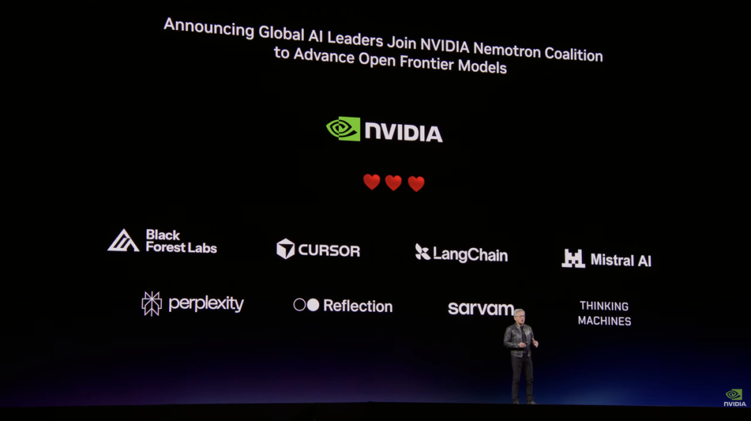 在台上,黄仁勋还宣布了一份让人眼前一亮的合作名单。Black Forest Labs、Cursor、LangChain、Mistral、Perplexity、Sarvam,以及 Mira Murati 创立的 Thinking Machines,悉数加入,共同推进 Nemotron 4 的研发。