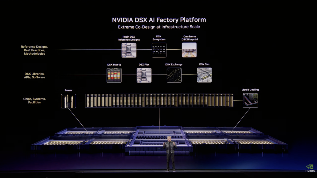为此,英伟达发布了 NVIDIA DSX 平台,基于 Omniverse 数字孪生技术,让工程师在真正动工之前,先在虚拟空间里把整座 AI 工厂仿真一遍,从散热到电网,全部模拟清楚。
