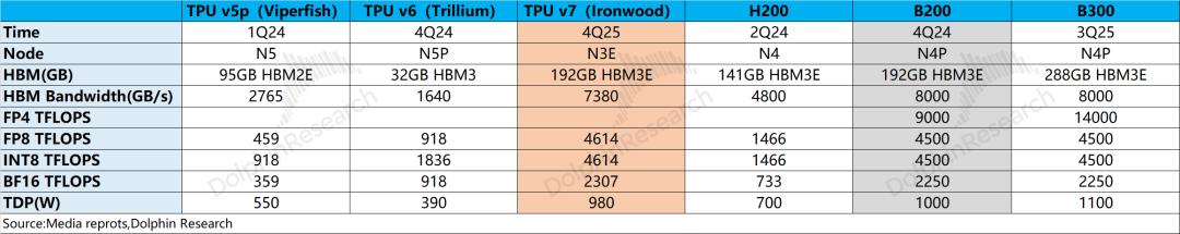 3)产品竞争力:当前谷歌TPUv7在FP8等领域的表现大致已经接近于英伟达的B200(2024年四季度量产),谷歌TPU大致落后于英伟达一年左右。