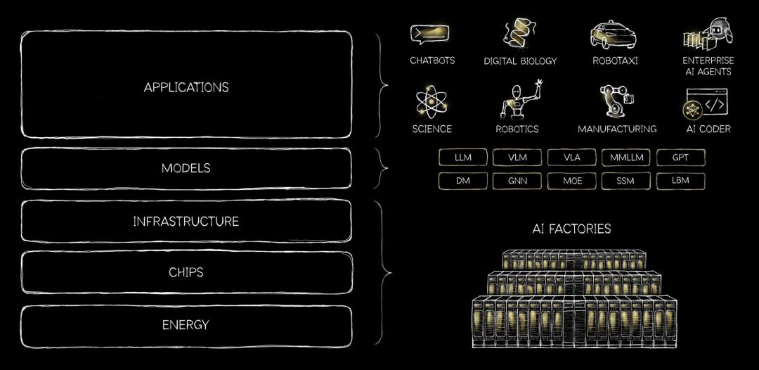 在软件和硬件之上,黄仁勋的演讲中还重点提到了 “AI 五层蛋糕”(The 5 Layer AI Cake)理论,这是他在本次大会上的核心概念,也可以理解为英伟达战略思考的起点。