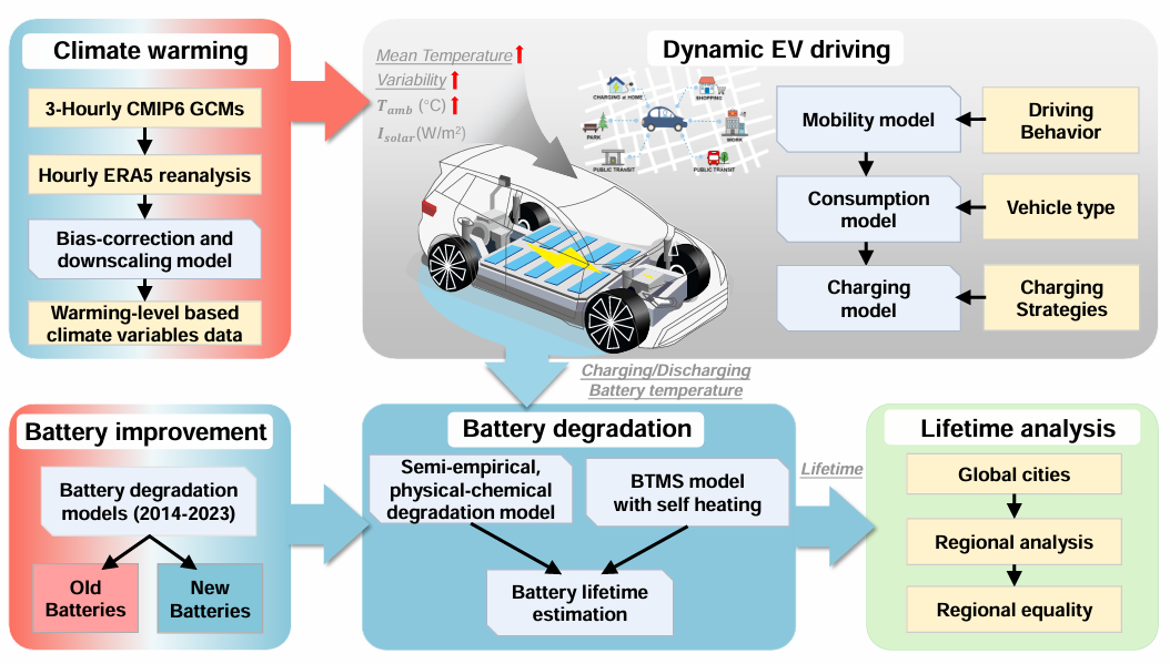 针对这一痛点,研究团队提出了一种深度融合车辆运行与电池物理机理的多模型耦合框架,突破了传统模拟的精度限制,实现了对电动汽车系统气候韧性与技术适应力的高保真度量化分析。具体而言,本研究构建了一套自下而上的综合模拟框架,将电动车行驶模型、电池热管理模型与电池退化模型相耦合,并结合经统计降尺度与偏差校正处理的CMIP6全球气候模式数据,对全球300座主要城市的电动汽车电池寿命展开系统评估。