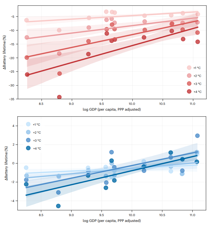 电池寿命变化的区域公平性分析显示了不同变暖情景(+1°C至+4°C)下GDP(人均,经购买力平价调整)与电池寿命缩短之间的关系 °C,如旧(上图,红色)和新(下图,蓝色)电池的图表所示。与高GDP国家相比,较陡的斜率表明低GDP国家随着变暖的寿命缩短幅度更大