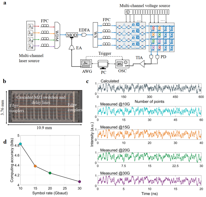光缓存单元(OMU)由一个8通道可调时间延迟线阵列芯片构成,如图3所示。单个可调时间延迟线由7个级联MZI光开关及连接延迟波导组成,延迟分辨率为4.93 ps(对应约200 GHz的自适应时钟频率),最大延迟时间达310.59 ps,延迟误差被严格控制在0.6 ps以内。通过调配不同光学路径的时间延迟量,团队进行了10 Gbaud到30 Gbaud码率下的系统计算能力评估,系统测试表明,在固定权重组合下的4通道并发计算精度为4.1至4.8 bits之间。