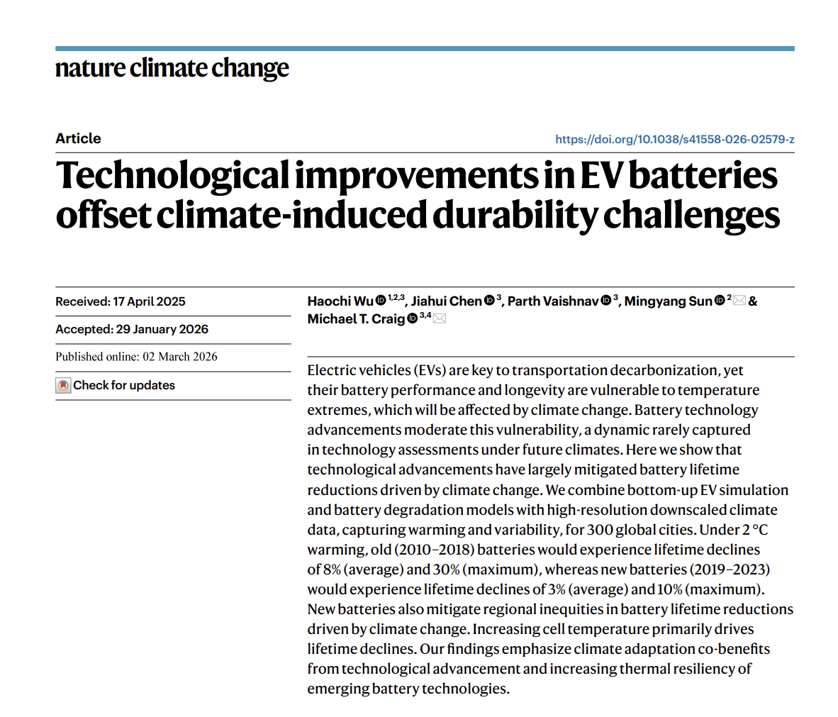 近日,北京大学先进制造与机器人学院孙铭阳研究员团队在气候科学顶级期刊《自然·气候变化》(Nature Climate Change)上发表题为《电动汽车电池技术进步抵消气候变化引发的耐久性挑战》(“Technological improvements in EV batteries offset climate-induced durability challenges”)的研究长文(Article)。