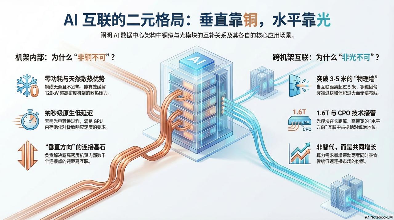 RockFlow 投研团队认为,我们正进入一个“垂直方向靠铜,水平方向靠光”的时代。这不是替代关系,而是随着总算力需求暴增,两者都在吃掉原本属于传统铜线和低速光纤的份额。