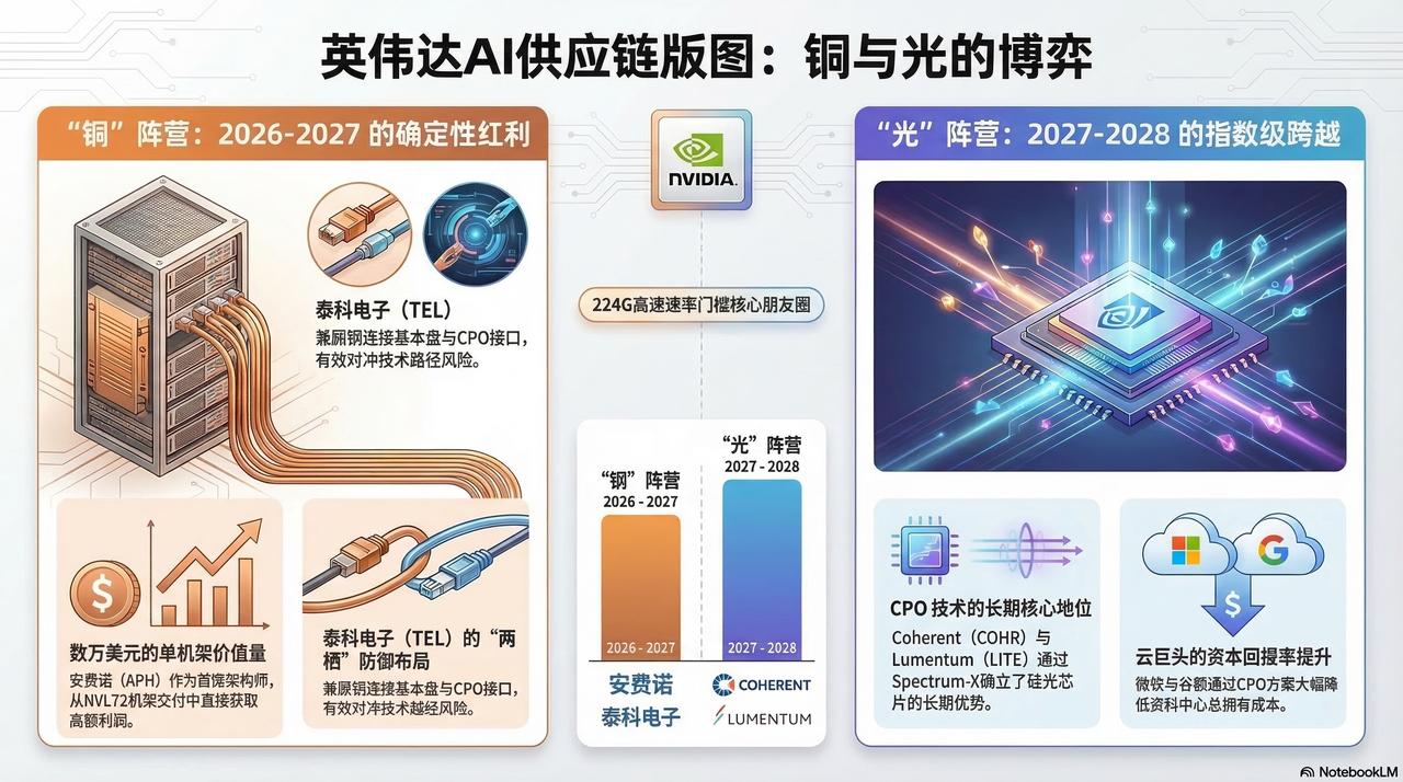 3)随着英伟达从芯片商转向系统集成商,只有进入其核心朋友圈的“连接器”厂商才能享受溢价。安费诺(APH)等锁定机柜内确定性利润的铜阵营标的、Coherent(COHR)等光阵营先锋均具备明显投资价值。