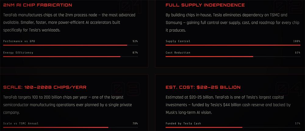 但根据TeraFab官网上的披露,其预估投资仅仅为200亿至250亿美元,还是来自特斯拉的支持,但特斯拉2026年的资本支出计划已经提升到 200 亿美元,但这些钱还不够Terafab一个项目烧的。