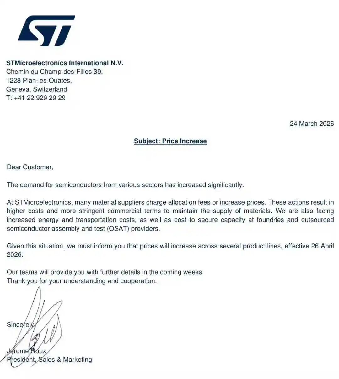 3月24日,业界传出意法半导体(ST)向客户发送涨价函。意法半导体表示,自2026年4月26日起,多条产品线的价格将进行上调。
