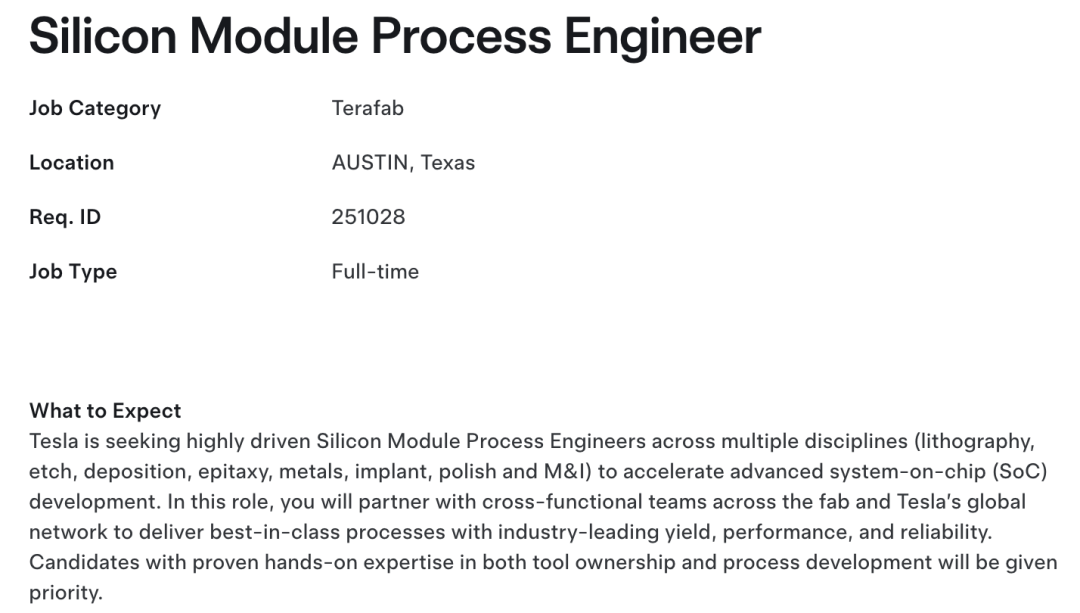 德州奥斯汀这边则在招硅工程师(Silicon Engineer),以及一名需要有“1亿美元以上资本项目”管理经验的技术项目经理(Technical Program Manager)。