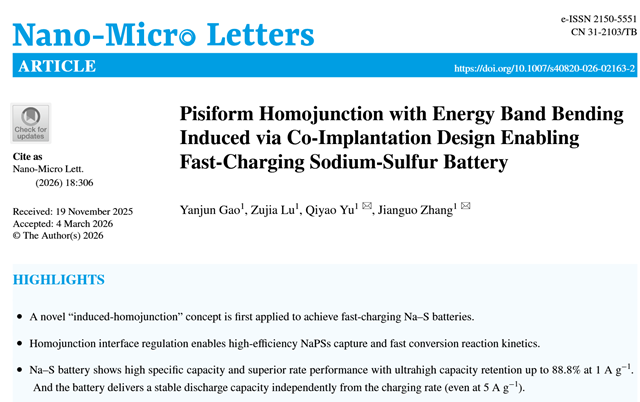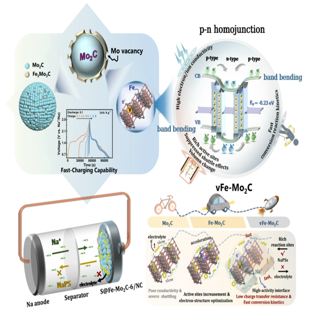 近日,北京理工大学机电学院张建国教授团队在国际顶级期刊《Nano-Micro Letters》(影响因子36.300)发表题为《Pisiform Homojunction with Energy Band Bending Induced via Co-Implantation Design Enabling Fast-Charging Sodium-Sulfur Battery》的研究性文章(DOI: 10.1007/S40820-026-02163-2)。文章提出了一种新颖的“诱导同质结”概念,通过铁掺杂和钼空位的协同设计构建了三明治型的p-n碳化钼同质结,相邻碳化钼结构的p和n型导电特性促使电子/空穴快速穿过界面,从而赋予反应位点高活性,促进多硫化物的捕获及原始的S-S键的断裂;伴随着能带弯曲过程,自发地建立双向的内在电场进而驱动离子/电子的高速运输,最终实现高深度的充放电过程和快速的转化反应动力学过程,表现极好的快充性能。通讯作者为张建国教授、于琪瑶副教授,第一作者为北京理工大学机电学院2022级博士生高艳君。