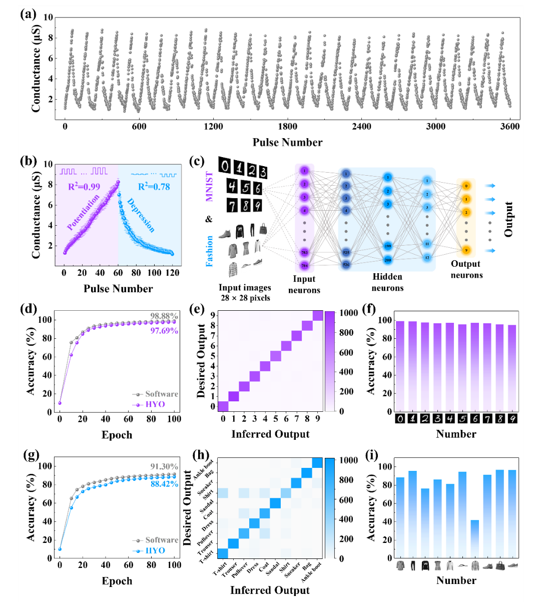 针对上述难题,西安交通大学电信学部电子科学与工程学院任巍教授、牛刚教授团队采用钇(Y)掺杂和衬底取向策略,成功制备出厚度仅为5.5纳米的外延钇掺杂氧化铪(HYO)铁电薄膜,该薄膜的剩余极化强度高达54.7μC/cm2,超过此前报道的绝大多数铪基薄膜。团队通过多种先进表征手段明确了该铁电薄膜呈现单一铁电正交结构并伴随一定程度的菱形畸变。基于铁电HYO薄膜优异的电学特性,团队构建了FTJ器件,该器件实现了8级清晰可辨的电阻态,开关循环次数超过105次。通过优化设计阶梯式电脉冲方案,器件的电导增强和抑制均实现了高线性度调控。在实际应用测试中,基于该FTJ构建的全连接人工神经网络,在MNIST手写数字图像数据集上实现了97.7%的识别准确率,在复杂度更高的Fashion-MNIST服装图像数据集上也达到了88.4%的优异识别准确率。该研究结果不仅凸显了外延铪基FTJs在神经形态应用方面的巨大潜力,还深入阐释了铪基材料结构与铁电性之间的物理原理。