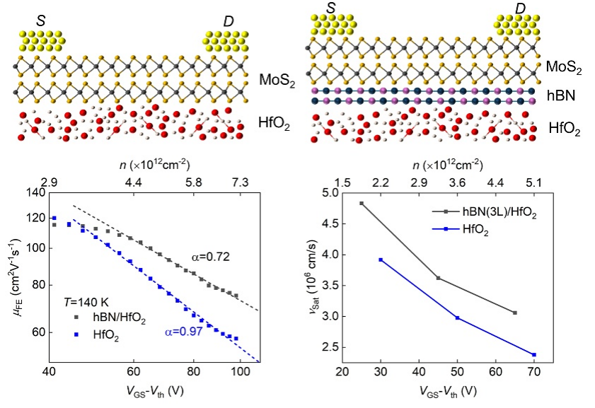 团队针对界面无序散射、介电屏蔽效应、热耗散对二维半导体载流子输运的影响机制展开研究。提出利用范德华绝缘体六方氮化硼(hBN)作为界面层,实现高k氧化物/二维半导体界面的解耦调控(图 2),系统且深入地揭示了高k氧化物/二维半导体界面对载流子输运的影响机制。首次清晰阐释界面介电屏蔽与无序散射的竞争机制,明确少层 hBN 的最优调控效果。实现了室温下MoS₂中载流子饱和速度的最高纪录:4.8×10⁶ cm/s。相关研究成果“Modulating the carrier transport at 2D semiconductor/high-k oxide interfaces with 2D hBN interfacial layers”发表于Appl. Phys. Lett. 127, 212101, 2025。2023级硕士研究生任泽诚为该论文的第一作者,陈鹏老师为该论文的通讯作者。该论文得到了国家自然科学基金面上项目等项目的资助。