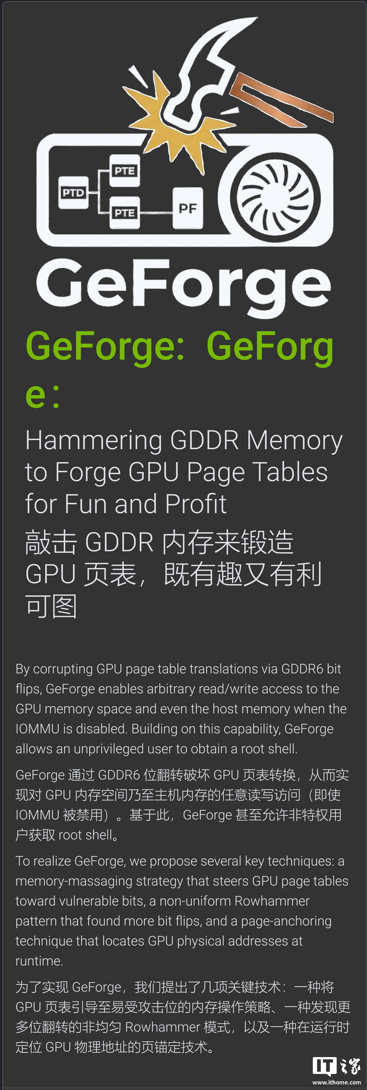 IT之家 4 月 3 日消息,科技媒体 Ars Technica 今天(4 月 3 日)发布博文,报道称研究人员发现针对英伟达显卡的 2 种 Rowhammer 攻击方式,成功突破 GPU 显存隔离,获取 CPU 内存完整读写权限,最终完全控制用户电脑。