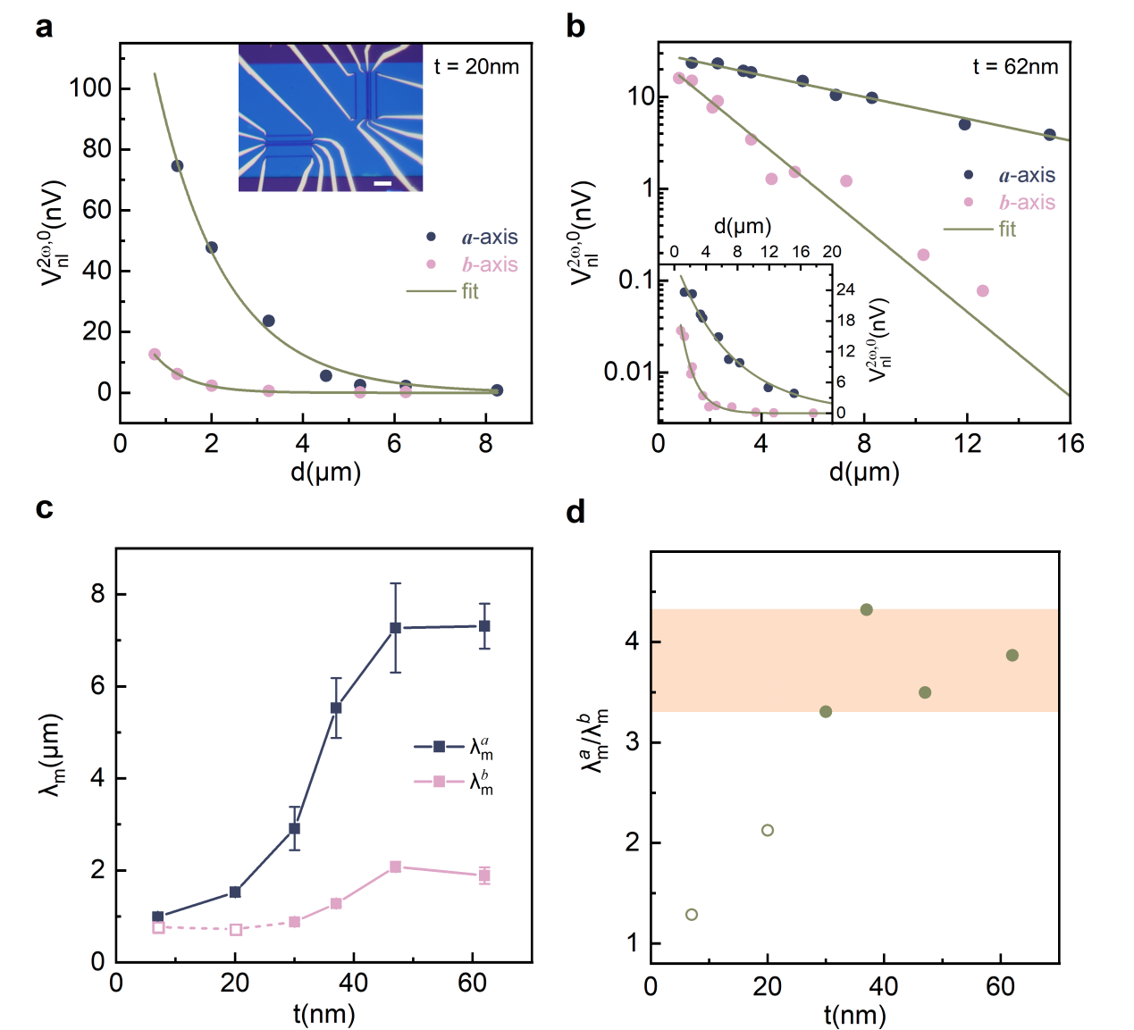 图2. CrOCl准一维磁子输运。(a)磁子沿着 a 轴(深蓝色) b 轴(粉色)两个方向的随距离衰减的行为,深绿色实线为指数衰减拟合,数据来自于厚度为20nm的样品。(b)与(a)相同,但数据来自于另一个厚度为62nm的样品。(c)不同厚度的样品两个方向的衰减长度。(d)两个方向的衰减长度之比,与理论计算值3.8相吻合