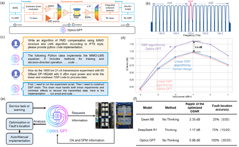 在实验验证中,Optics GPT的三大应用成果展现了其从算法生成到系统管控的全面能力:在自动代码生成方面,模型根据自然语言指令自动生成可部署的DSP代码,在1600公里传输实验中,其生成的线性DSP性能与人工设计相当,而非线性算法更带来0.4 dB的性能增益,实现了真正的算法自动生成;在自主网络管理方面,模型在20种故障场景下实现100%的诊断准确率,显著优于通用大模型;在现网性能预测方面,模型预测链路的OSNR平均误差仅0.44 dB,与专用神经网络相当,证明其已内化物理规律,具备真实的工程推理能力。