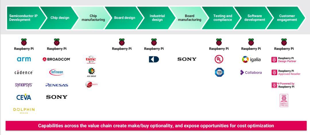 如下图所示,树莓派一方面,通过与Broadcom、Renesas等伙伴协同设计关键器件,同时在I/O控制等核心节点实现自研,树莓派在供应链与架构层面建立起差异化;另一方面,通过芯片与整机的协同设计(co-design),在性能、成本与集成度之间实现更优平衡,并叠加持续投入的软件生态,构建起难以被简单复制的护城河。