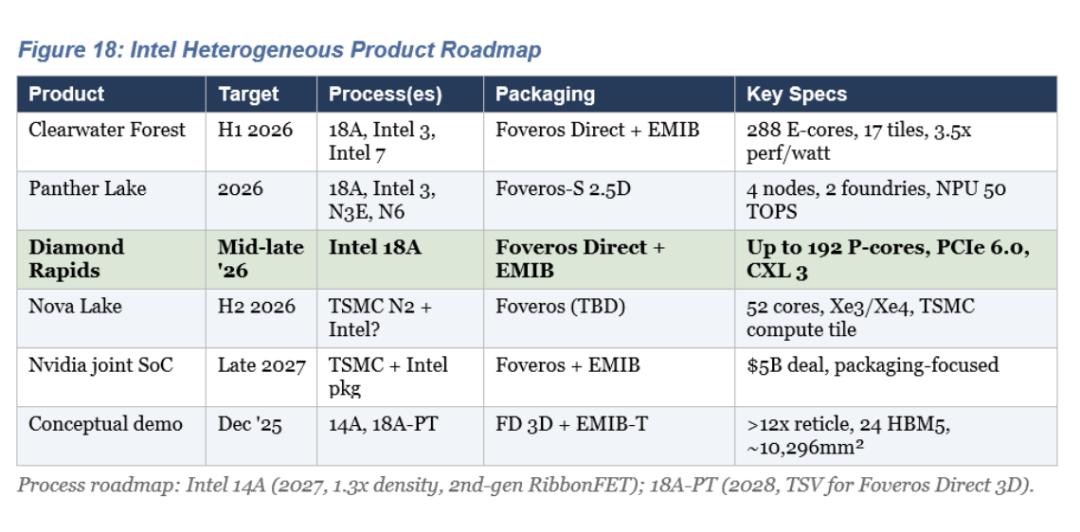 Diamond Rapids 的目标是在 2026 年中后期推出:最多 192 个 Panther Cove P 核心,支持 PCIe 6.0、CXL 3,TDP 为 500-650W。直接竞争对手是 AMD EPYC Venice(Zen 6,台积电 2nm)。