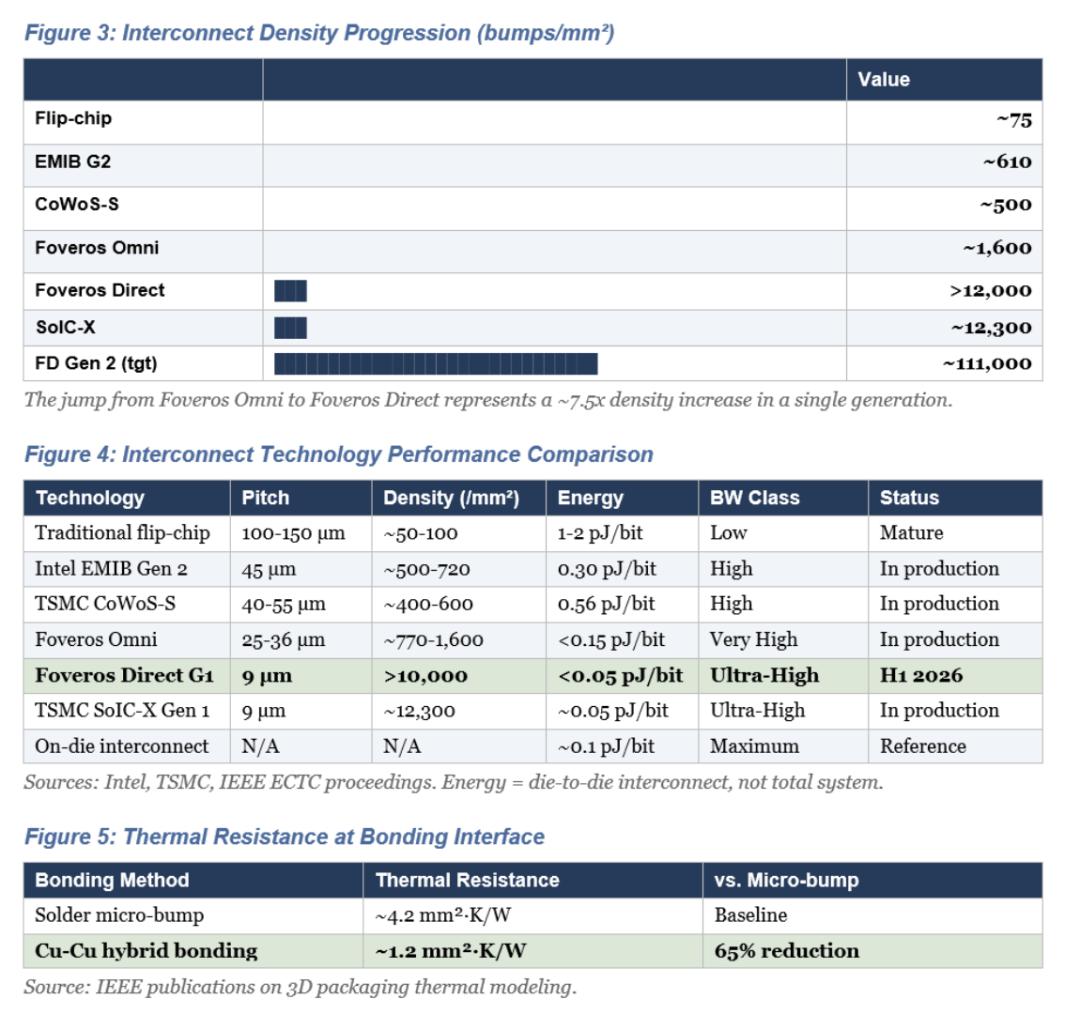 英特尔的Foveros Direct技术实现了9微米间距(每平方毫米约12,000个连接),每比特功耗低于0.05皮焦耳。芯片内通信的功耗约为每比特0.1皮焦耳。混合键合技术已经突破了一个临界点,使得芯片间连接在实际应用中与单个芯片内部连接一样高效。