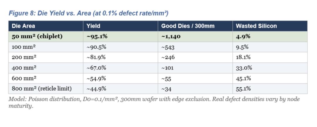 良率复利是一把双刃剑。单独来看,小块tile的优势在数学上可能并不明显,尤其是在组装损失率较高的情况下。
