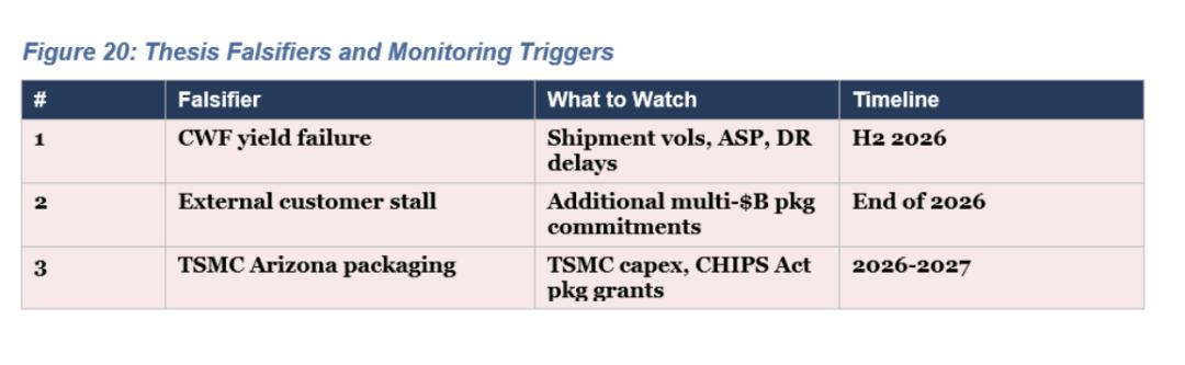 谬误一:Clearwater Forest 的良率报告。如果英特尔在 2026 年下半年之前无法在 17 芯片架构上实现经济可行的良率,那么封装护城河理论将受到实质性削弱。密切关注出货量、平均售价趋势以及 Diamond Rapids 的进度信号。