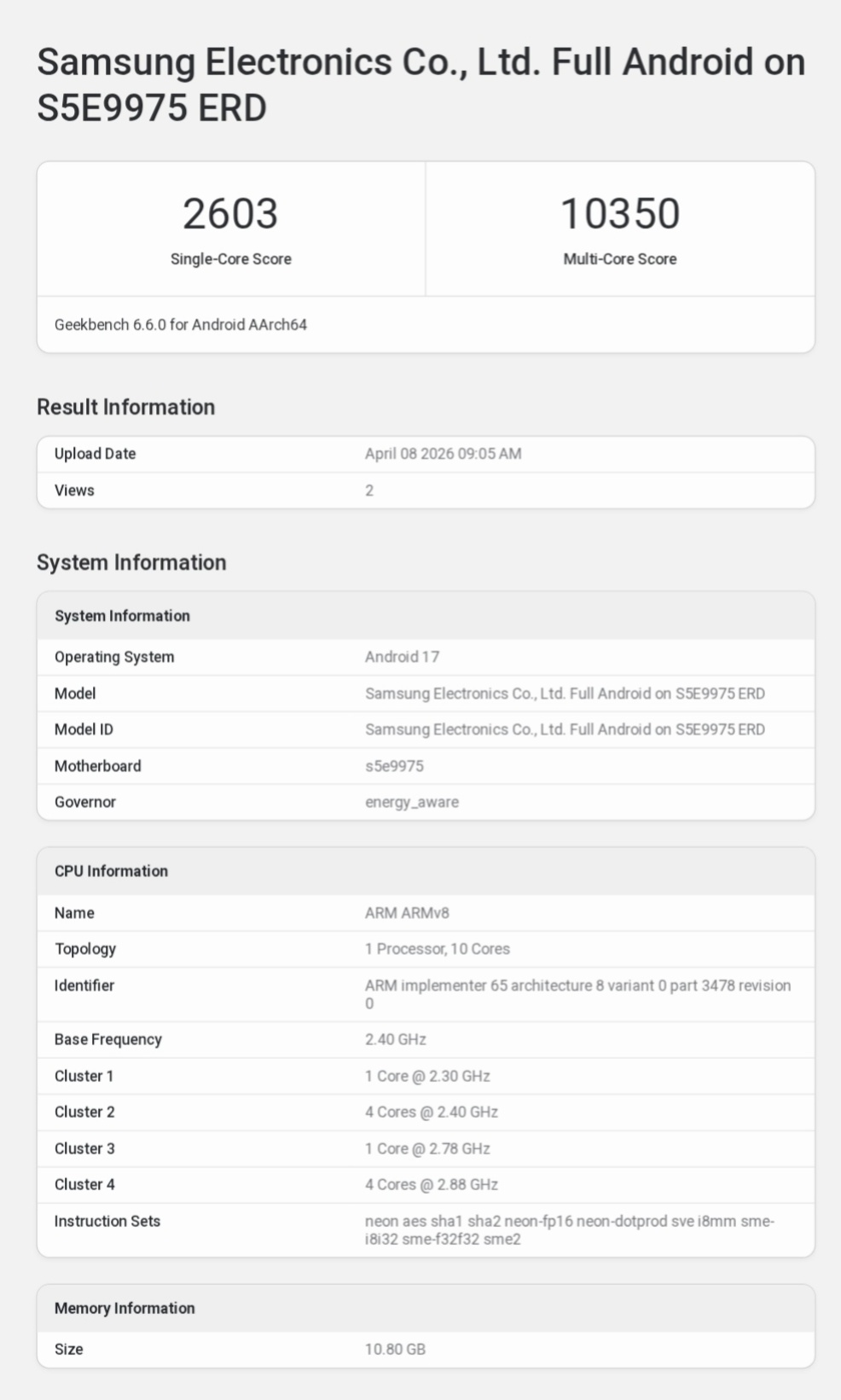 IT之家 4 月 9 日消息,科技媒体 Wccftech 发布博文,报道称三星 Exynos 2700 芯片昨日(4 月 8 日)现身 GeekBench 跑分库,6.6.0 版本单核成绩为 2603 分,多核得分 10350 分。