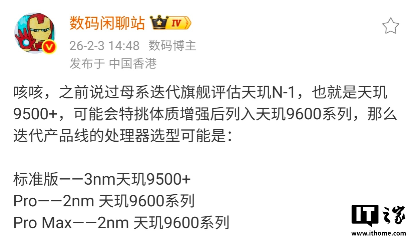 IT之家注意到,该博主曾在今年 2 月表示,天玑 9500+ 处理器可能会特挑体质,增强后列入天玑 9600 系列,迭代产品线的处理器选型有望分成三杯: