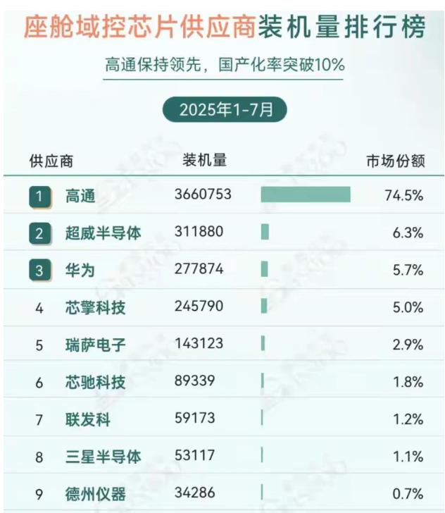 对比来看,座舱芯片依然是高度依赖进口,按照2025年盖世数据,高通占比高达70以上。