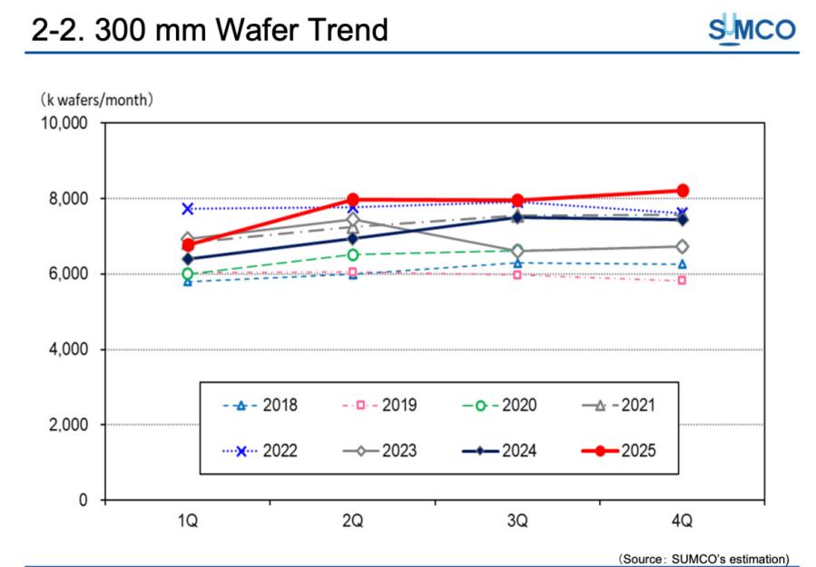 300mm晶圆片2018年~2025年的走势情况(图源:SUMCO 2025年财报)
