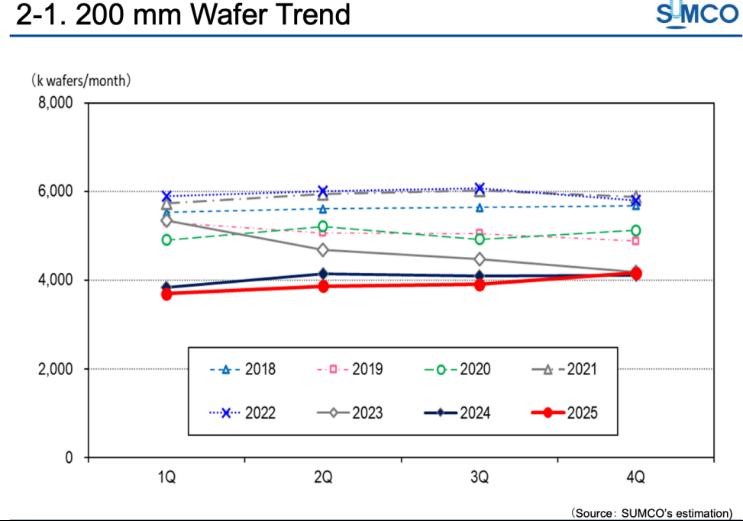 200mm晶圆片2018年~2025年的走势情况(图源:SUMCO 2025年财报)