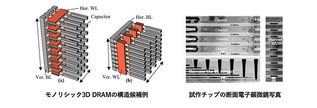 左图:(a)具有垂直位线的结构;(b)垂直字线的实现方法。条状部分为电容器。右图:(a)沟道附近的结构;(b)垂直字线中的阶梯状水平位线;(c)垂直位线结构中沟道和字线的堆叠结构。